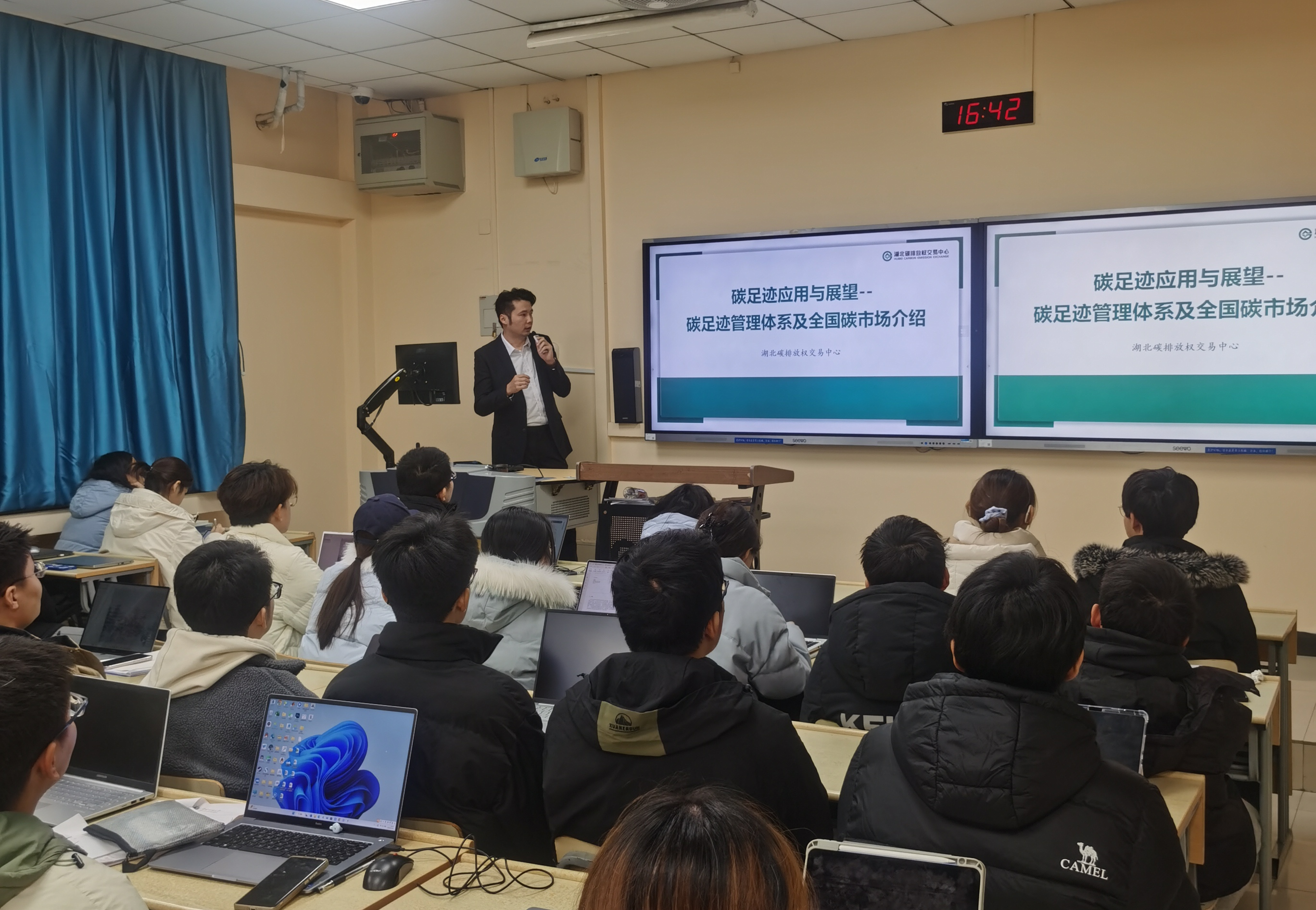 深入积极地贯彻该精神指示,已实施多期该计划,并获得了良好的师生反馈效果。2024年12月29日,《碳足迹理论方法与实践》课程开展产业专家进课堂活动,邀请湖北碳排放权交易中心绿色贸易部经理李威博士作为主讲人,为本科生带来了主题为《碳足迹应用与展望——碳足迹管理体系及全国碳市场介绍》的精彩授课。