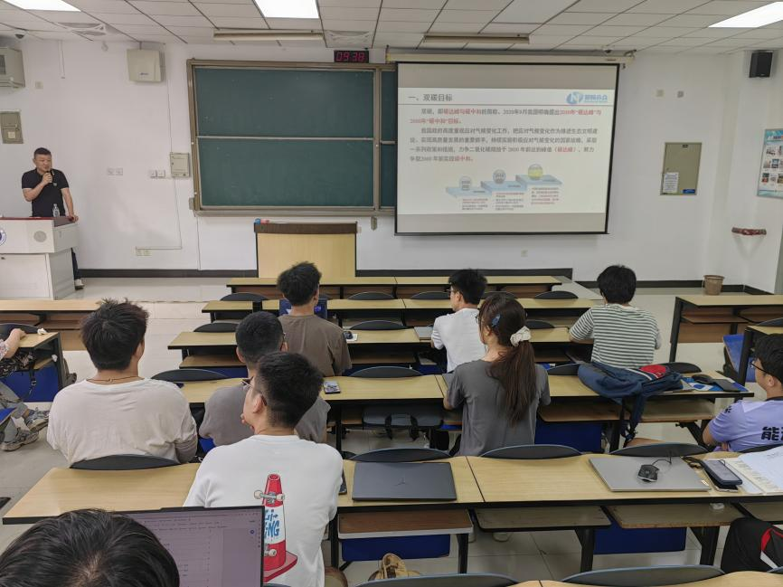 教学中,蔡经理从碳市场及碳交易的起源出发,对其意义、内容及我国相关现状等进行了详细的讲述,通过结合自身的从业经历和相关项目成果的介绍,其向同学们阐明且展示了碳交易作为一种利用市场机制控制和减少温室气体排放的政策工具,通过将温室气体排放权作为一种商品进行交易,从经济及成本的角度,企业通过购买或出售碳排放配额来调整自身的排放水平,切实能够实现成本效益最优的减排目标,对于助力双碳目标的实现有着不可替代的作用。