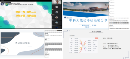 会议伊始,先由主持人向同学们介绍本次讲座的流程和主讲嘉宾,接着五位同学依次进行考研经验的分享。上岸中国科学技术大学的张龙海同学讲述了自己考研的学习过程,他从就业学历要求、工资薪酬等角度向大家讲述了自己考研的原因,并与同学们分享了自己备考期间的作息安排。他强调考研要持之以恒,不能遇到困难就轻言放弃,提醒同学们要合理安排自己的复习时间,积极备考。上岸华中科技大学的刘健同学则从选择考研院校出发,提醒准备考研的同学要明确自己奋斗的目标,锲而不舍的学校。上岸重庆大学的沈圳同学也向大家讲述了自己的学习过程,分享了自己各科的复习方法,并表达了对同学们能够成功上岸的美好祝愿。