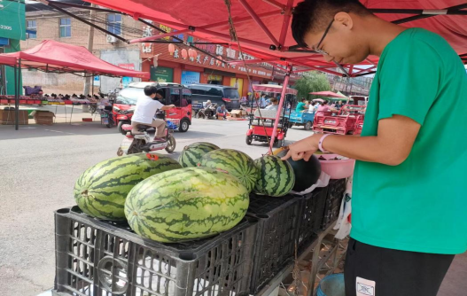 经过多方的比较考察,实践团成员选取西红柿、西瓜等应季蔬果进行直接售卖或二次加工后售卖。因天气炎热,西瓜采用制成西瓜汁和西瓜棒冰的方式进行销售,吸引了大量游客,丰富了助农途径和产品库。在日常农产品销售工作之余,实践团成员还牢牢把握节日效应。七夕之际,实践团成员去到当地花市进行选品进货工作,并将其附有祝福语句的卡片,在七夕当天售卖。
