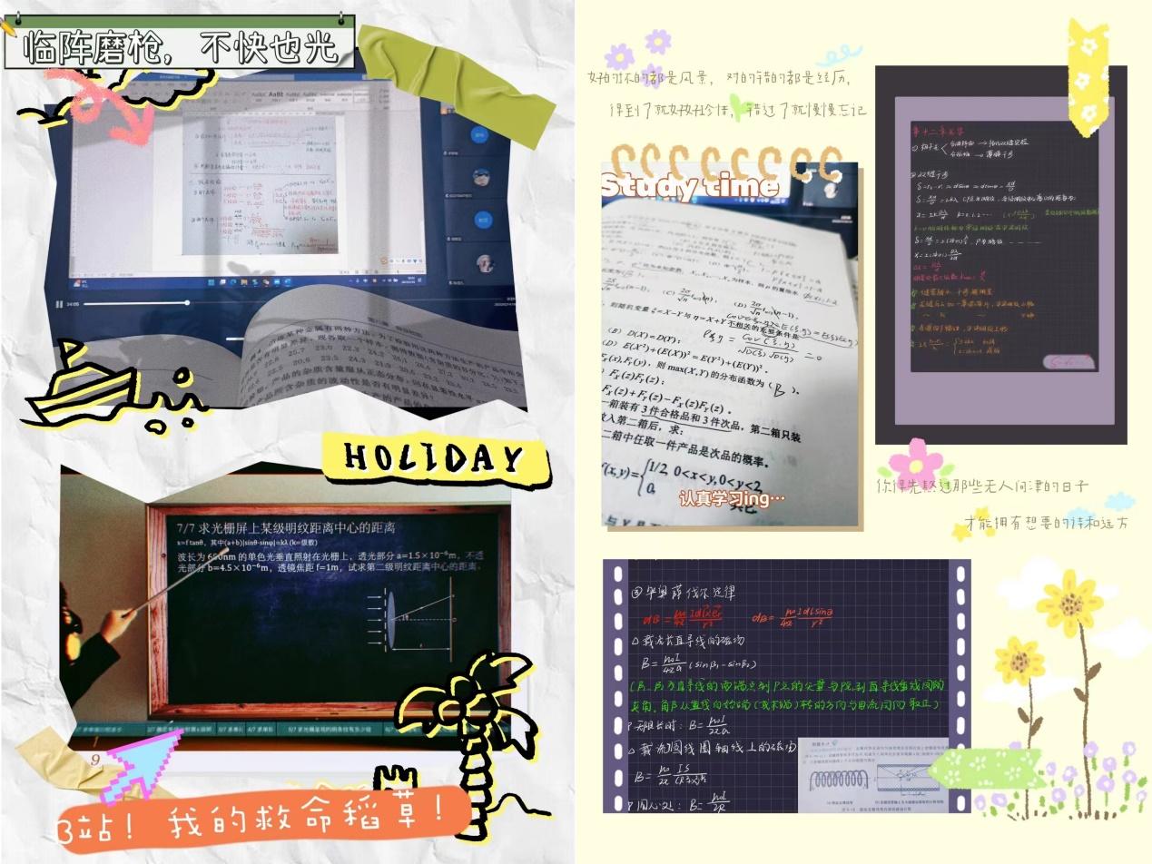 本次活动主要通过线上进行。截止至2月15日晚12时,收到了来自各年级三十余份的作品。随后,评委们根据主题、内容、制作和创新四个方面对作品进行综合打分,并进行评奖。活动期间,同学们纷纷晒出自己高等数学和大学物理的笔记本与错题集,认真听课、挑灯夜读的照片,还在plog作品中吐槽自己“临阵磨枪,不快也光”。同学们用彩色笔勾划重点,在试题上进行标记,与同伴进行讨论交流,并通过网络平台填补知识漏洞。同学们的复习方法多种多样,而且针对性强、重点突出、有条不紊。