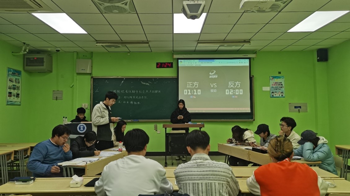 辩论队孔晨宇、李泉润、王旗、胡涵之、张楠等五名同学担任评委。在个人主题辩论赛中,参赛选手们根据自己的辩题表明个人观点,同时评委针对选手论证的漏洞进行犀利提问,双方在问答中碰撞着思维的火花。在团队辩论赛中,则围绕着“网络围观有/无助于社会热点的解决”主题,盘问小结环节,双方都就场上的局势展开了详细清晰的陈述和总结,努力为自由辩论环节奠定有利的基础。最后,评委团综合选手们在两个赛场上的表现,本次活动正方赢得辩论胜利,孟宇欣、李展颜、郭耀辅、董尧顺等5人获得本次活动的一等奖。