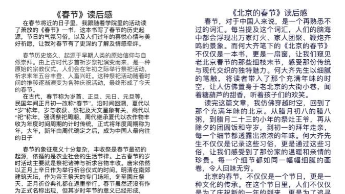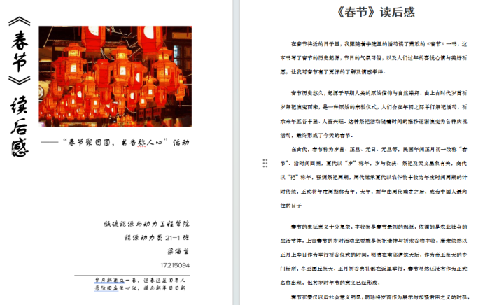 本次读书活动以线上形式开展,要求参赛同学阅读春节有关的书籍,并在规定时间内提交读后感。活动期间,同学们阅读了《北京的春节》《春节》《舌尖上的新年》等有关春节的书籍,结合自身体验,写作出了多篇具有真情实感的读后感。最后,主办方本着客观、负责、公正的态度,从文章语言逻辑、结构清晰度、真实感受等多个角度进行打分,评选出了13篇获奖作品。其中,2021级张艺杰和梁海兰同学的作品以语言翔实、感情充沛脱颖而出,体现出同学对春节的深刻理解和文化的传承。