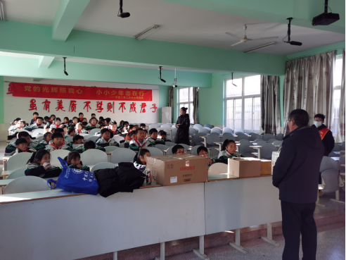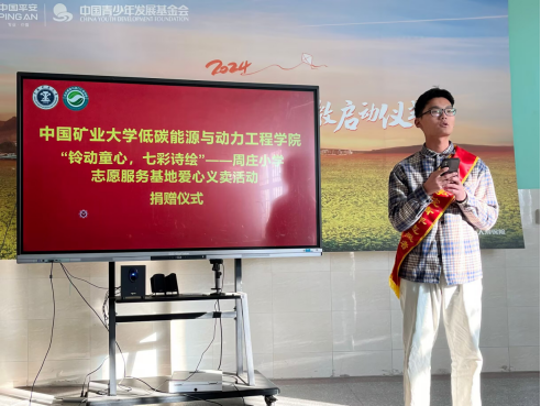 青年志愿者到来的欢迎,明确本次活动开展的意义及重要性。随后,志愿者们亲手为周庄小学学生代表送上捐赠的物资,传递来自矿大的关爱。学院青年志愿者协会林曦同学代表全体志愿者表达了对孩子们未来的期许与对乡村教育工作者的敬佩,并表达了作为矿大学子将继续为志愿服务奉献青春的决心。