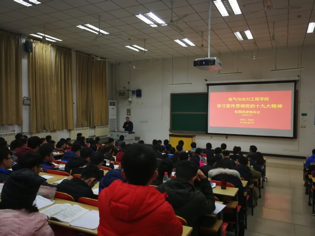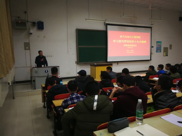 于11月27日晚在南湖校区博二楼C201教室举办“学习党的十九大精神”校园巡讲报告会。学院党委副书记兼行政副院长许宏志、学工办公室主任项青出席本次报告会,电气与动力工程学院2016级全体同学积极参与。