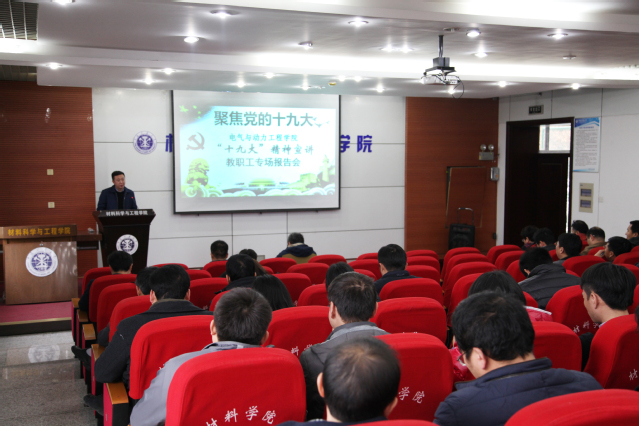 11月29日下午,学院在南湖校区材料电力楼A105报告厅组织举办了十九大精神宣讲教职工专场报告会。学院院长郭楚文,党委副书记兼行政副院长许宏志,教学副院长徐瑞东,科研、研究生副院长韩东太出席本次报告会。学院全体教职工参加了报告会。