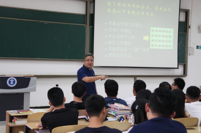 9月13日下午,学院2017级研究生新生入学教育报告会在南湖校区博4楼B101举行。学院科研、研究生副院长韩东太主持报告会并为全体研究生新生做了入学教育报告。