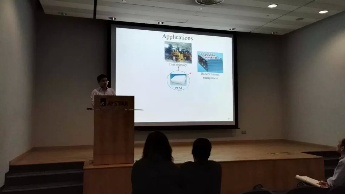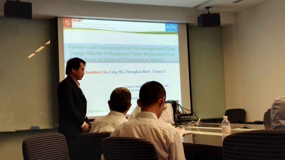 工程热物理研究所饶中浩教授以及2014级博士研究生刘臣臻分别做了题为“The Lattice Boltzmann Investigation for the Melting Process of Phase Change Material in an Inclining Cavity”和“Synthesis and Characterization of Microencapsulated Phase Change Material of Magnesium Sulfate Heptahydrate/Urea Resin via Emulsion Polymerization Method”的口头报告,并与与会同行进行了深入交流。