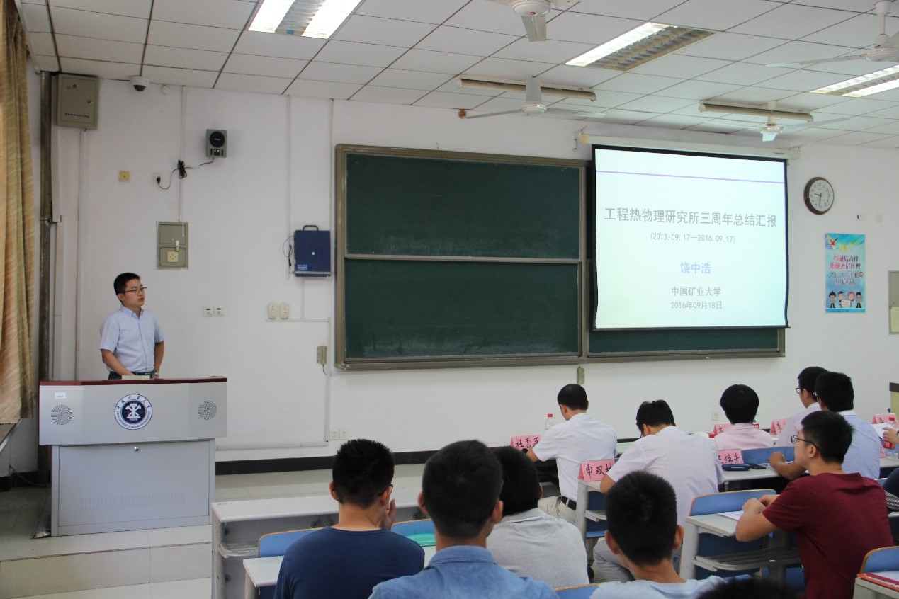 开幕式过后,所长饶中浩教授对工程热物理研究所过去三年的成长进行了工作总结报告。报告从所况介绍、学术成果、人才培养及学术交流四个方面详细地梳理了研究所的发展历程,着重讲述了三年来工热所取得的各项突破,并希冀研究所师生继续努力以取得更大的成绩。随后,由齐聪、杜雪平和郑克晴三位老师分别做了题为“基于格子Boltznmann方法的纳米流体传热特性研究”、“受限空间内椭圆管翅空冷换热器性能研究”及“固体氧化物燃料电池的数值模拟”的学术报告,引起了全体师生的热烈反响与讨论。至此,上午的会议内容告一段落。