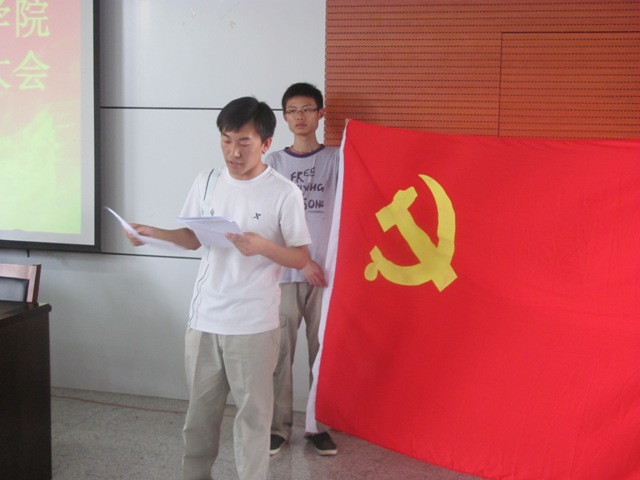 会议在庄严地国歌声中拉开了帷幕。团委书记田玉河首先宣读了优秀毕业生党员名单和校级优秀共产党员、先进学生党支部推荐名单。随后,党总支副书记张磊为院级优秀党员颁发荣誉证书并向他们表示祝贺。颁发完毕,全体起立,面对党旗,新党员进行入党宣誓,老党员重温党员誓词。