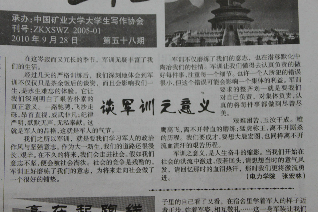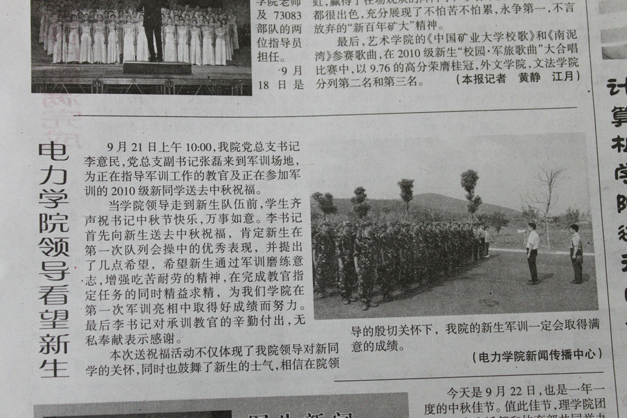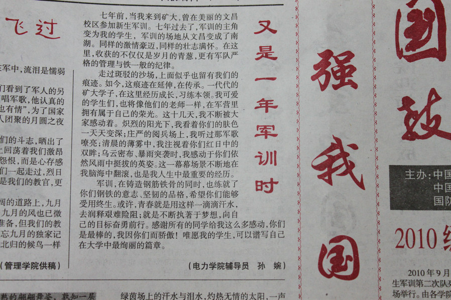 热烈祝贺厕拍 2010级新生军事训练4篇稿件刊登在我校9月28日发行的《国防教育与军训生活》报纸上。刊登作品分别为: