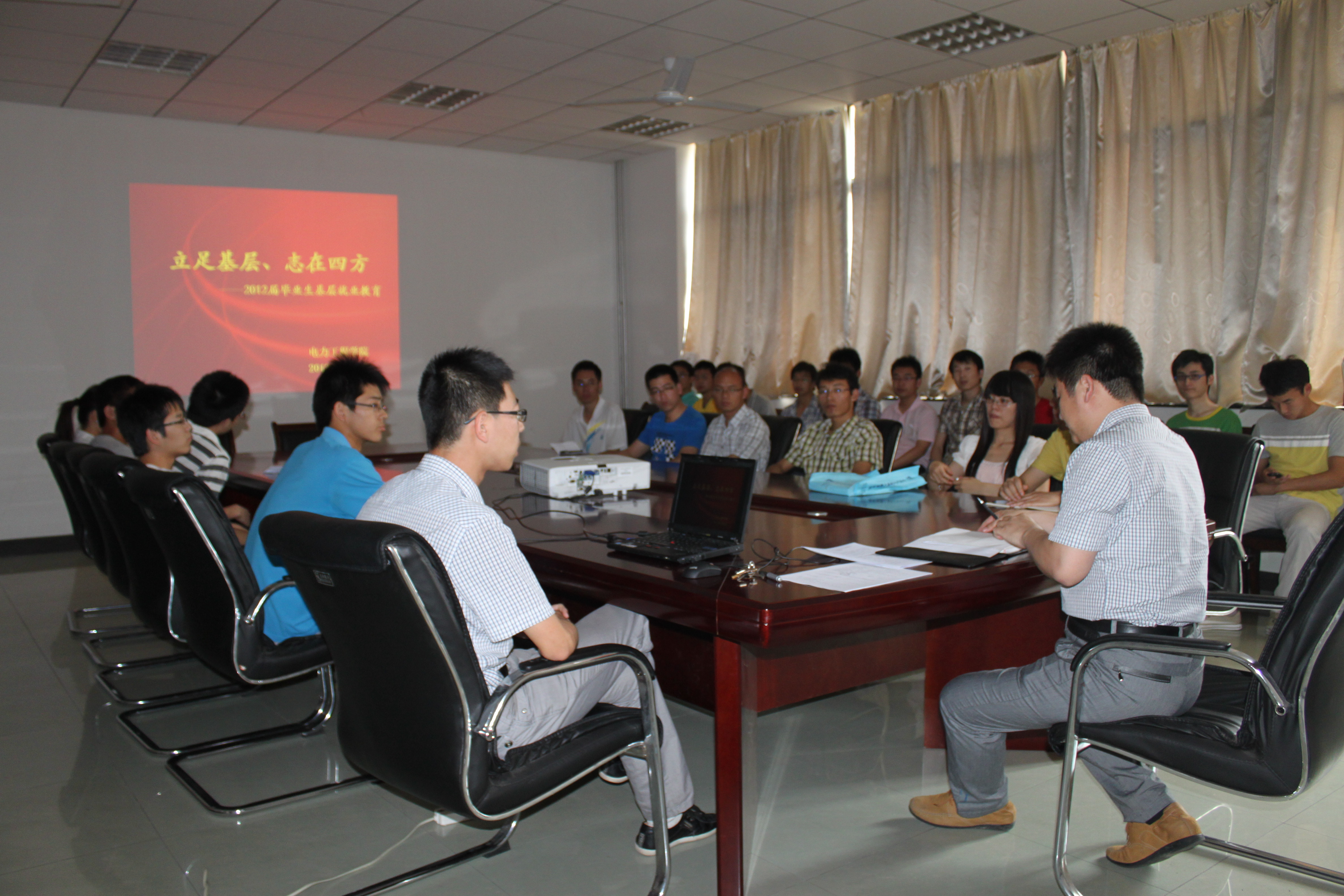 6月5日下午,电力工程学院在学院楼会议室召开了2012届毕业生基层就业教育会,本次会议围绕“立足基层、志在四方”展开。电力工程学院党委副书记兼行政副院长张磊出席会议,学院2012届毕业生代表参加了本次会议,会议由2008级辅导员张昕喆主持。