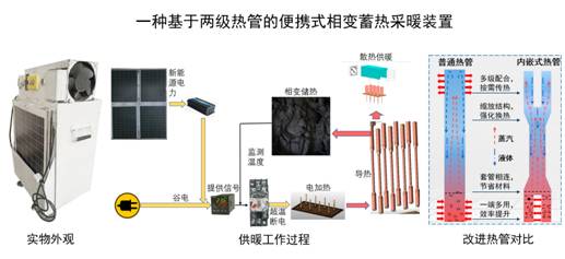 赵佳腾老师与饶中浩老师带领的团队设计了一种基于两级热管传热的,通过电加热将谷电和以太阳能为主的新能源电力以热能的形式储存在复合相变材料中。将相变储能技术和新型热管的传热特性充分结合,集热管传热、相变储能、温度调控、系统电控、便携驱动、谷电和光电供能等为一体的便携式移动蓄热采暖系统。平衡了峰谷电压并解决了现有采暖设备的安全性和复杂性等问题。在一定程度上还增大了新能源的消纳量。该系统建造和使用的成本低,清洁环保,为我国节能减排和可持续发展事业提供了一定的理论依据。