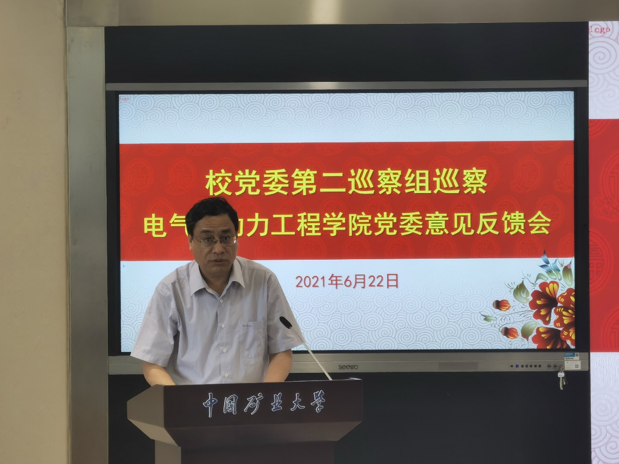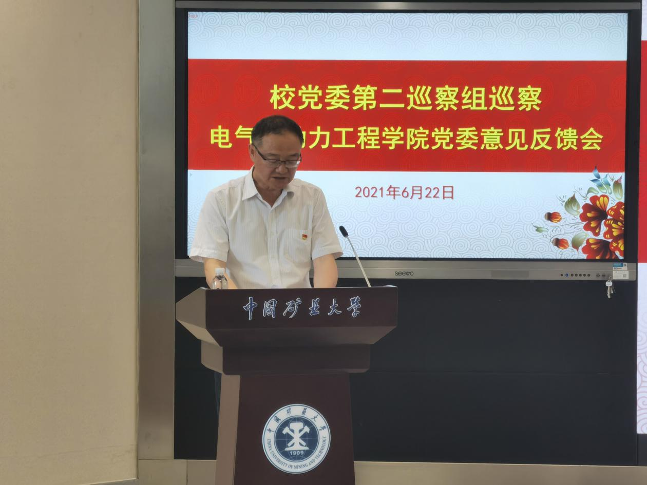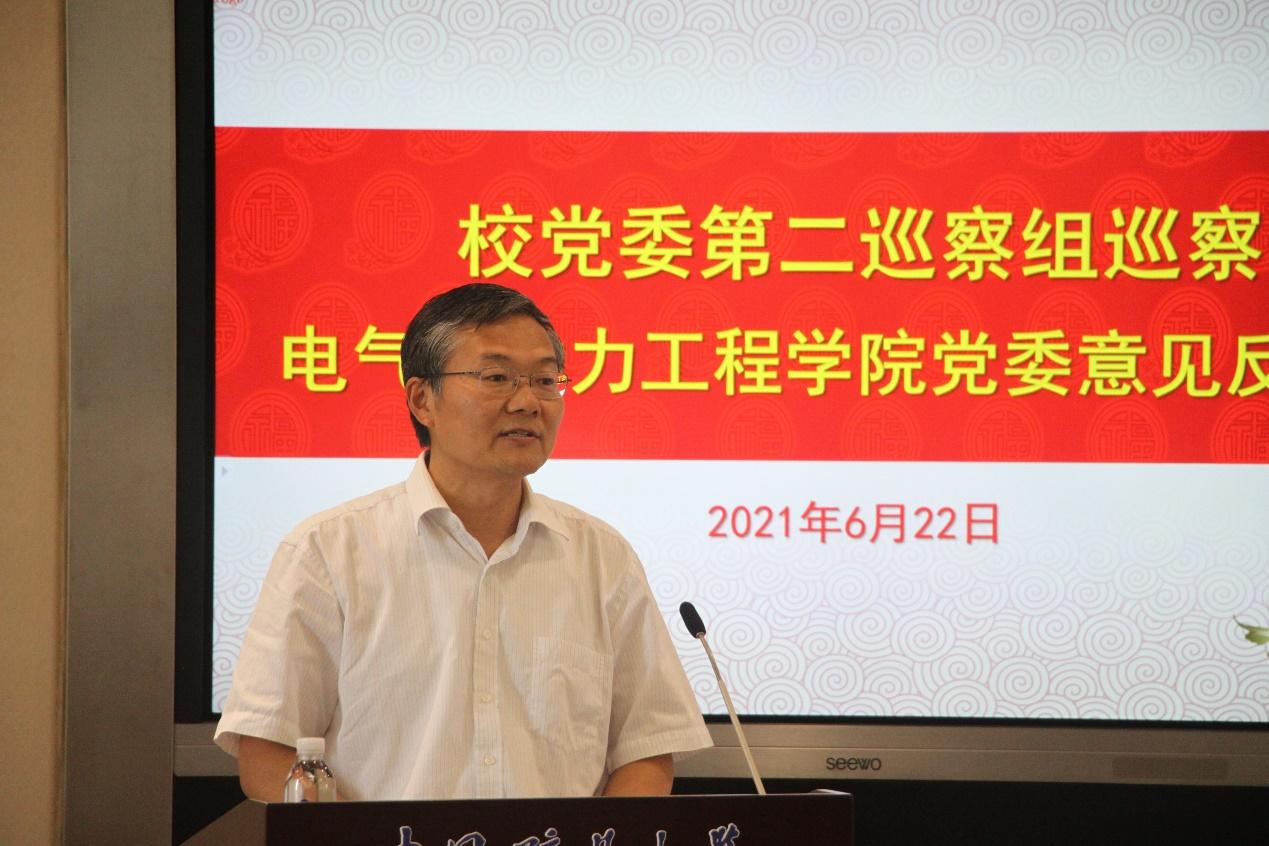 翟金玉组长宣读了《关于巡察电气与动力工程学院党委的反馈意见》,对学院党委工作进行了总体评价,用主要的篇幅指出了学院党委在落实党中央以及上级决策部署、学院党组织建设等方面存在的问题以及群众反映突出的问题,并提出了整改落实的意见和建议。