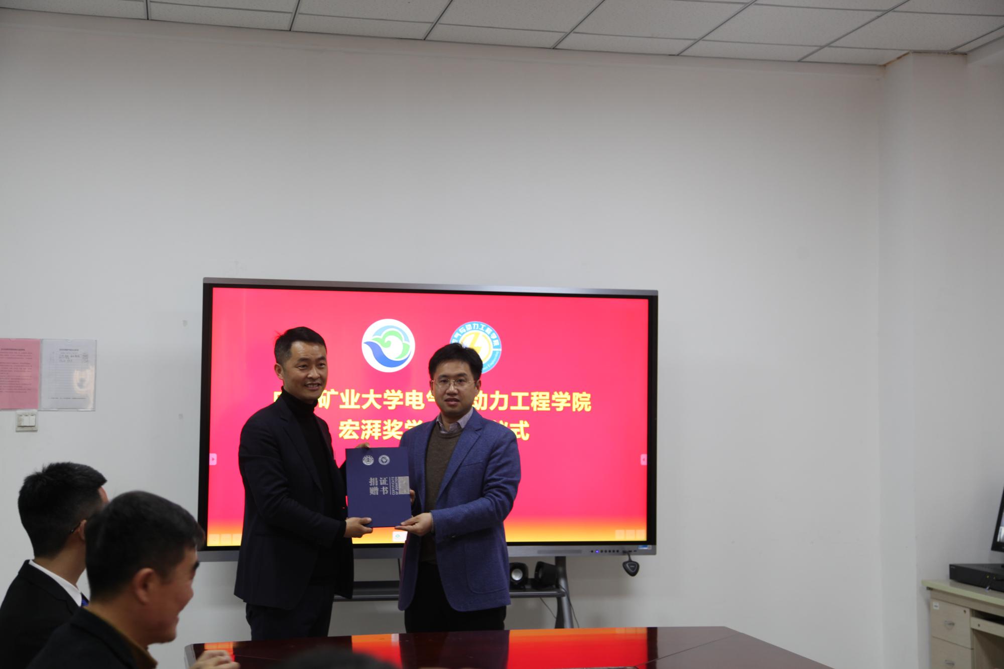 副院长徐瑞东向宏湃培训南京公司颁发捐赠证书并感谢企业长期以来关心和支持学院发展,对获奖同学表示祝贺,希望同学们在今后的工作中奋发进取,以实际行动回报母校、回馈社会。徐瑞东副院长表示,学院会继续落实立德树人根本任务,全面加强学院学风建设,完善人才培养体系,搭建更好的校企平台,为电力行业培养更高质量的人才。同时,希望企业能够向学院反馈参训学生情况与用人单位意见,帮助学院进一步优化人才培养方案。