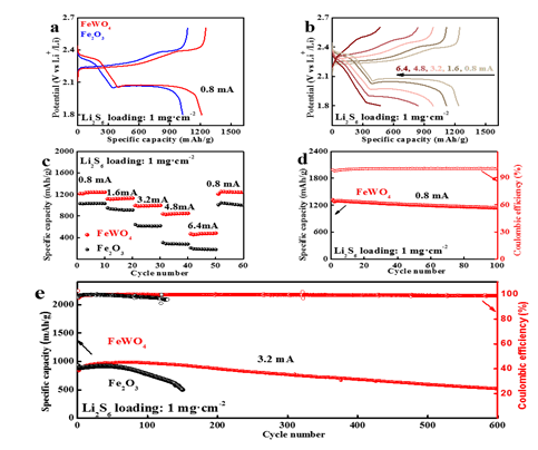 近日,电力学院储能与传热课题组通过简单的水热法制备了FeWO4纳米棒,并将其作为多硫化物的吸附剂和催化剂。这种制备方法简单,无毒以及低成本,可以扩展到工业化生产中。FeWO4纳米棒对多硫化物具有强力的吸附作用,可以有效缓解多硫化物的“穿梭效应”,提高活性材料的利用率。DFT计算表明,FeWO4纳米棒与多硫化物之间存在很强的化学相互作用,可以有效限制多硫化物的扩散,提升锂硫电池的循环稳定性。最重要的是FeWO4纳米棒可以提高锂硫电池的离子扩散能力,加速多硫化物的氧化还原动力学,进一步提高循环稳定性和速率性能。装配FeWO4纳米棒的锂硫电池可以在0.8 mA电流下提供1318 mAh g-1的初始放电容量,整个循环过程中库伦效率高达97%。当电流提升到3.2 mA时,600次循环中每周的容量衰减率仅为0.07%。这项研究为制造高性能锂硫电池储能系统提供了可行的策略。
