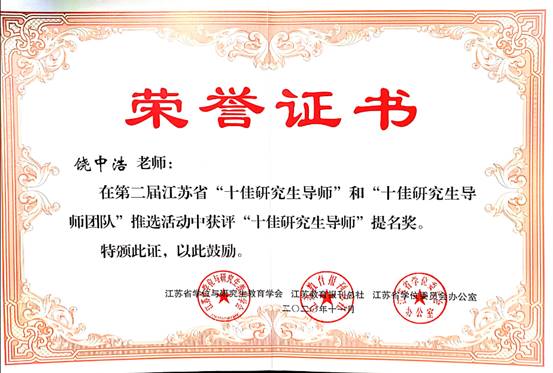 近日,第二届江苏省“十佳研究生导师”和“十佳研究生导师团队”推选活动评选结果公布,经学校推荐、材料核实、网络宣传、征求意见、专家评审,厕拍 饶中浩教授获得“十佳研究生导师”提名奖。