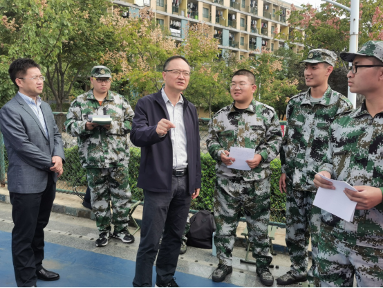 新生学子良好的精神风貌。院党委书记伍小杰首先向承训教官表示感谢,对教官严明的军纪、过硬的施训能力表示充分的肯定。同时,伍小杰书记赞扬了新生们高涨的精神面貌,向参训新生表达了自己的深切期望,希望同学们在日后的训练中能发扬吃苦耐劳的精神,磨砺意志,增强体魄,努力上好开学第一课。随后,院领导班子与军训加油站的随训同学亲切交谈。伍小杰书记关心了随训同学的身体情况,希望大家平时适当加强锻炼,积极融入军训第一堂课。在看到随训同学抒写的诗词感言时,伍书记赞扬了大家的才情与热情,鼓励同学们要像大家的所思所感一样,发扬顽强斗志,严格要求自己,提高自身综合素质。在院领导的关心慰问之下,军训场上一时充满了温暖的笑容与热烈的掌声。