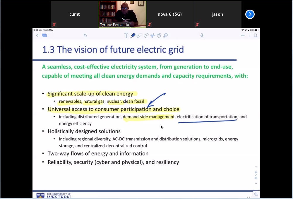 青年教师和2017级本科生在线讲授《电力系统基础(英语)》课程。Tyrone Fernando教授采用ZOOM视频直播软件,以澳大利亚电力系统为例,主要讲授了电力系统现状、新能源渗透下系统稳定性以及电力系统未来发展趋势等相关知识。电力学院青年教师和2017级本科生共计260余人参加了此次网络视频授课。多位青年教师和同学积极参与了课堂互动,就教学方法和授课内容与Tyrone Fernando教授进行了在线交流。