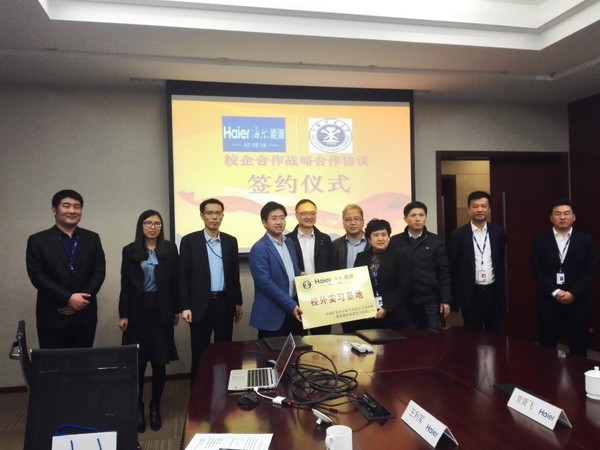 实习基地”揭牌。学院科研、研究生副院长韩东太,能源与动力工程系主任王利军、副主任何光艳,海尔智慧物联生态圈人力资源部长姜巧,海尔能源副总经理马英华、邵凯,项目经理党贇飞出席了签约揭牌仪式。
