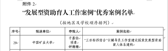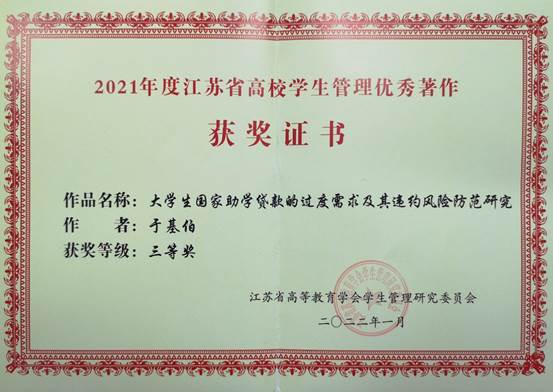 于基伯副书记主持的“智行”资助育人辅导员工作室申报的《“三目标四结合”以辅导员工作室建设探索发展型资助育人体系建构》案例获“发展型资助育人工作案例”优秀案例;江苏省高等教育学会学生管理研究分会公布了2021年度江苏省高校学生管理优秀著作评选结果,于基伯副书记的专著《大学生国家助学贷款的过度需求及其违约风险防范研究》获三等奖。