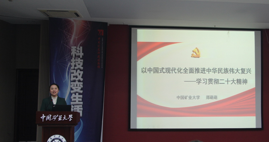 郑萌萌以《以中国式现代化全面推进中华民族伟大复兴——学习贯彻党的二十大精神》为题,阐述了党的二十大报告的重大意义,从会议要点解读、报告要点解读、报告重要论断及思想解读三个方面带领大家系统学习了二十大报告的丰富内涵与精神要义。她从会前准备阶段、会前预备阶段、会中召开阶段、会后公报阶段对会议要点进行了解读;从总论内容、具体内容、结束语内容对二十大报告进行了详细解读;从大会主题、三个务必、归根到底是两个“行”、党的中心任务、中国式现代化的五个特色等进行了报告重要论断及思想解读。
