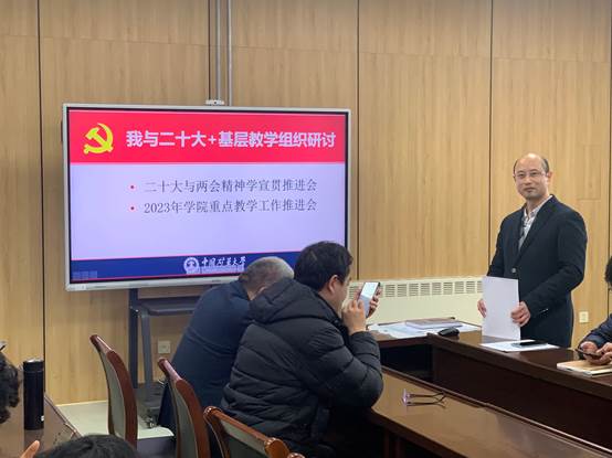 会议第二部分是以二十大与两会精神为指引,贯彻学院教学会议决定,推进2023年教学重点工作。会议对2023年学院七项教学重点工作进行了说明,主要包括教学竞赛、微课竞赛、江苏省高校教师教学创新大赛、国家一流课程、微专业申报、产教融合、课程思政等,并确定了每项工作的负责人。