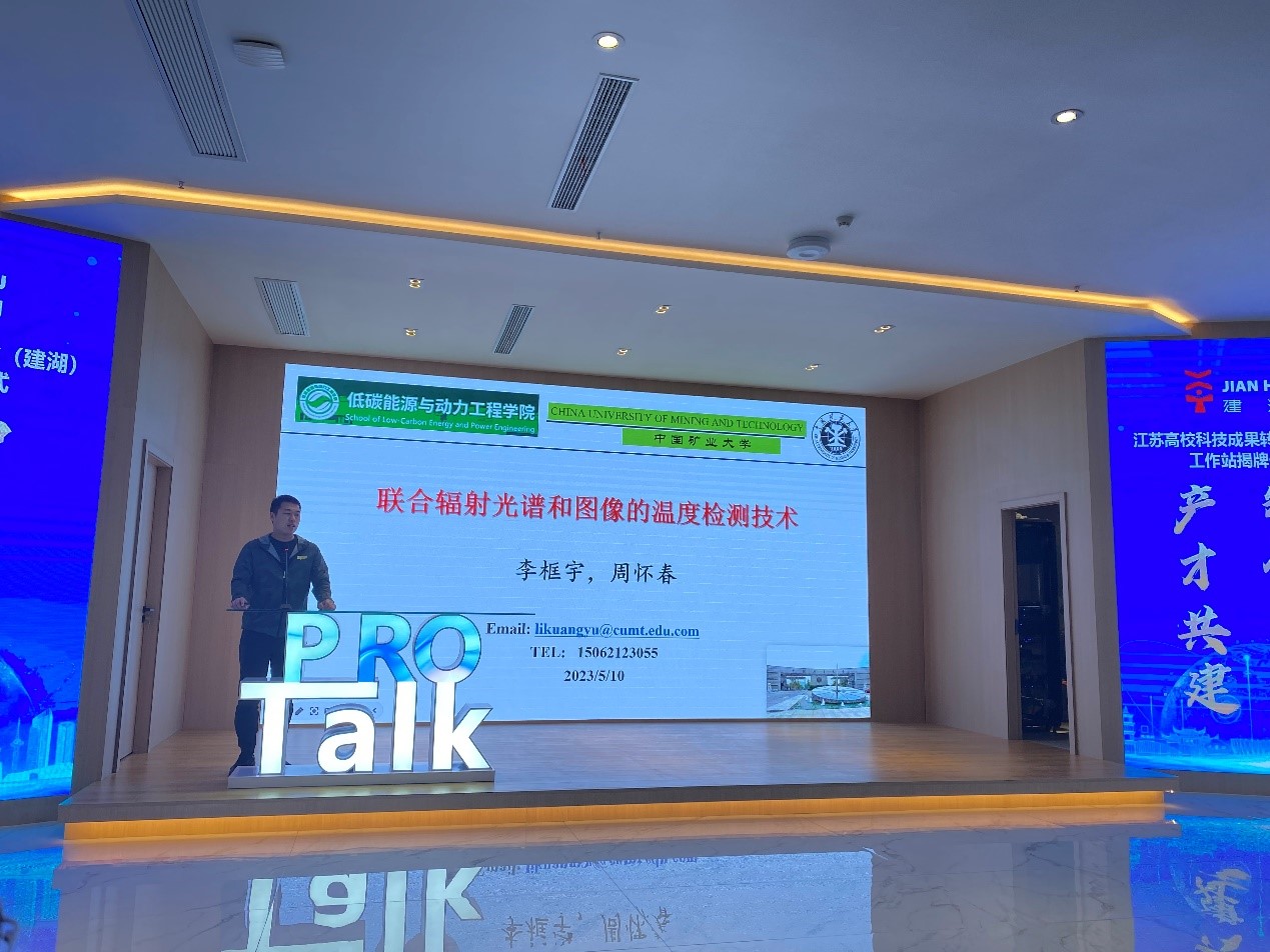 揭牌仪式前,江苏省高校科技发展中心在现场召开了专题调研座谈会,相关高校专家与参会企业家代表进行了深入交流,现场进行了企业技术需求介绍和高校科技成果路演展示。路演展示期间,李框宇博士向与会嘉宾作题为《联合辐射光谱和图像的温度检测技术》的报告,汇报了周怀春教授团队在辐射测温领域的最新研究进展和相关产品,针对建湖县高温锻造产业市场需求,李框宇介绍了便携式图像测温仪最新进展情况。