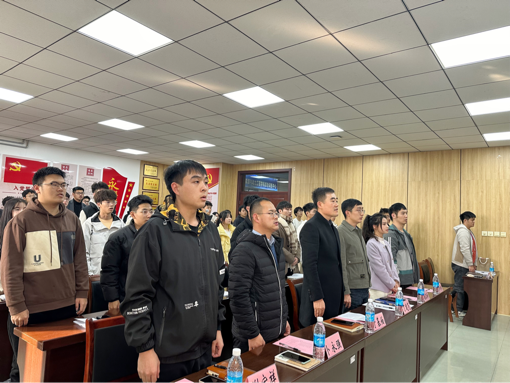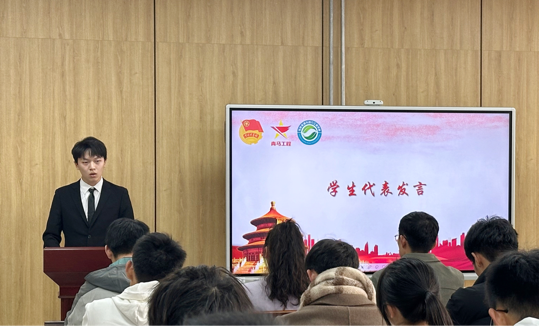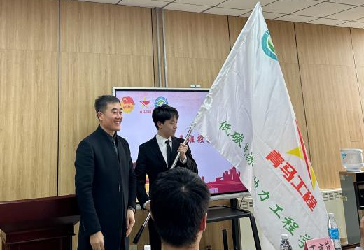 青马班班旗授予青马班班长肜浩楠。学工办主任丁建范宣读培训班学员名单,介绍青马班课程安排、培训内容和纪律要求,希望参加培训学员要端正学习态度,处理好培训与学习、工作、生活之间的关系,积极参加培训过程中开展的各项活动,在学生中发挥先锋模范带头作用。肜浩楠同学作为学生代表上台发言,感谢本期青马工程为同学们提供了学习交流平台,希望以青马培训为契机,同学们可以增强责任意识和激发担当精神。仪式结束,青马工程培训举行了以双碳目标下的时代要求与能动青年学子成长为主题的开班第一课。