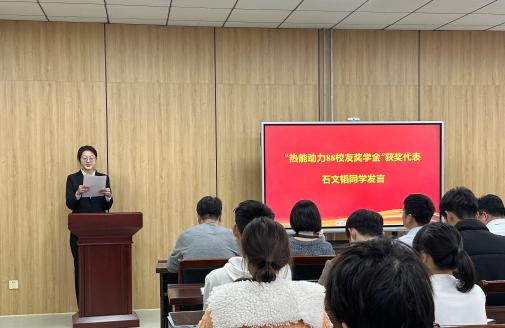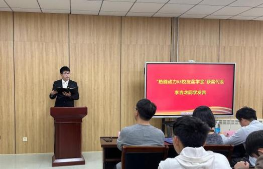 仪式上,学工办主任丁建范宣读热能动力88校友奖学金表彰名单。获奖学生代表石文韬和李吉龙先后上台发言,向辛勤培育的母校和老师表示最诚挚的感谢,向一直以来关心学院发展、支持资助育人工作的校友们致以诚挚的敬意,号召同学们以杰出校友为榜样,希望在今后取得更大成绩,为学院和学校发展贡献出力量。