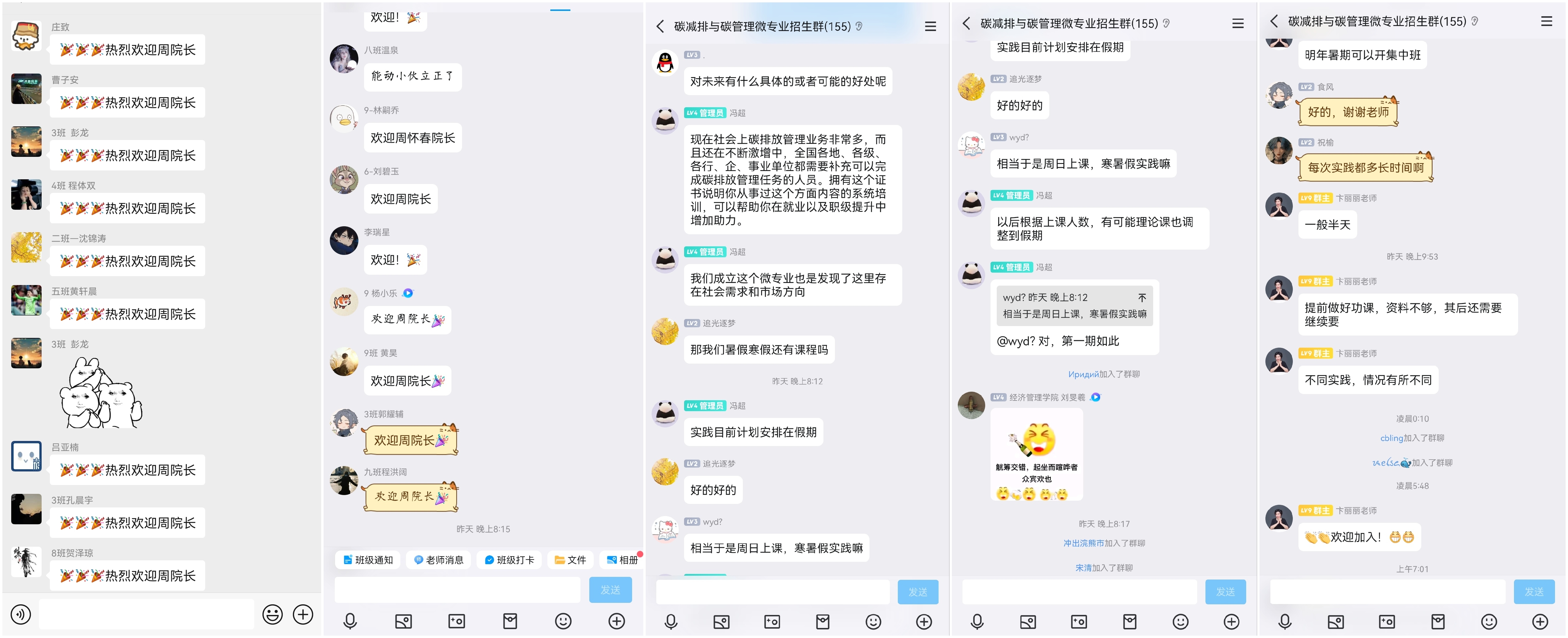 的微专业涉及能源、环境、管理、经济等相关学科,致力于碳排放管理与碳减排理论与实践培育,对标《碳排放管理员国家职业标准》三/五级/初级工碳排放管理员培训与资质认定。“碳减排与碳管理”微专业课程组的全体老师积极宣传和推广有利于学生就业的这项工作。“碳核算、碳足迹、碳市场、碳交易、碳管理”五大板块吸引了各个学院的学生,目前加入招生群的学生超过140人,课程组冯超等部分老师在现场和学生积极互动答疑。因为报名人数还在继续增加,教务部已同意适当延长报名时间。