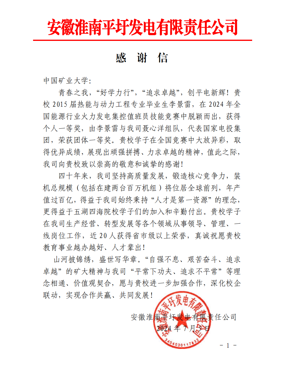 信中提到,我校2015 届热能与动力工程专业毕业生李景雷,在 2024 年全国能源行业火力发电集控值班员技能竞赛中脱颖而出,获得个人一等奖;并与公司成员组队,代表国家电投集团荣获团体一等奖,在全国竞赛中大放异彩、取得优异成绩,展现出顽强拼搏、力求卓越的精神。此外,我校在安徽淮南平圩发电有限责任公司生产经营、转型发展等各个领域从事领导、管理、一线岗位工作的校友中,有近 20 人获得省市级以上荣誉,成绩斐然。