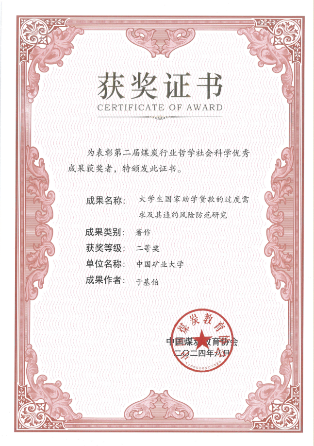 近日,中国煤炭教育协会表彰了第二届煤炭行业哲学社会科学优秀成果奖,学院党委副书记、校“E起资助”辅导员工作室负责人于基伯教授独著《大学生国家助学贷款的过度需求及其违约风险防范研究》获二等奖。
