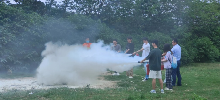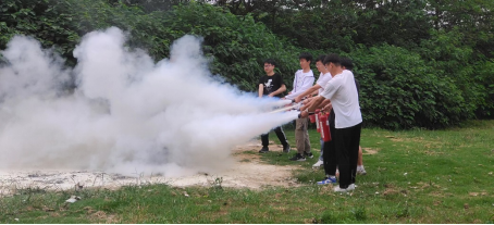 实际操作前,保卫处王锐老师向我们详细讲解了火灾的处理流程和灭火器的选择。随后王老师讲述了干粉灭火器、二氧化碳灭火器的作用原理及注意事项,并且演示了灭火器使用中的“提”、“拔”、“握”、“压”四个关键步骤和细节。灭火演练时,师生五人一组,使用灭火器对模拟火灾现场进行实际灭火操作,熟悉灭火器使用方法。